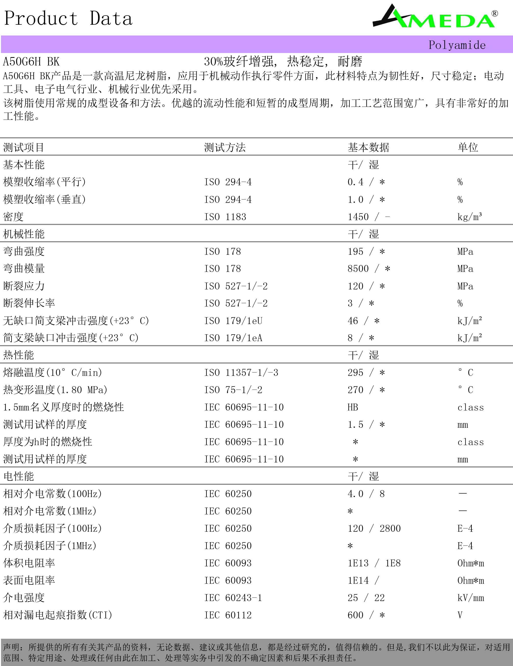 A50G6H BK产品是一款30%玻纤增强高温尼龙树脂,热稳定, 耐磨,应用于机械动作执行零件方面,此材料特点为韧性好,尺寸稳定;电动 工具、电子电气行业、机械行业优先采用。