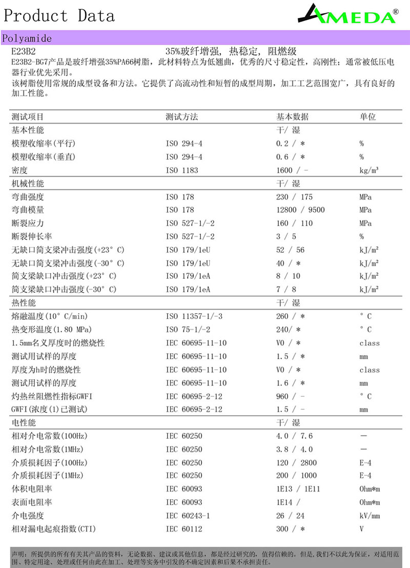 E23B2-BG7产品是玻纤增强35%PA66树脂,热稳定,阻燃级,此材料特点为低翘曲,优秀的尺寸稳定性,高刚性;通常被低压电器行业优先采用。
