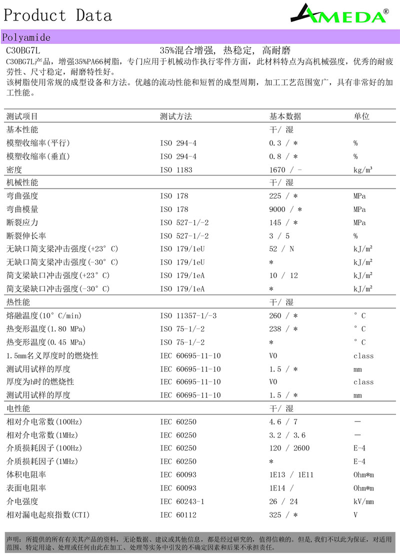 C30BG7L产品,混合增强35%PA66树脂,热稳定,高耐磨,专门应用于机械动作执行零件方面,此材料特点为高机械强度,优秀的耐疲劳性、尺寸稳定,耐磨特性好。