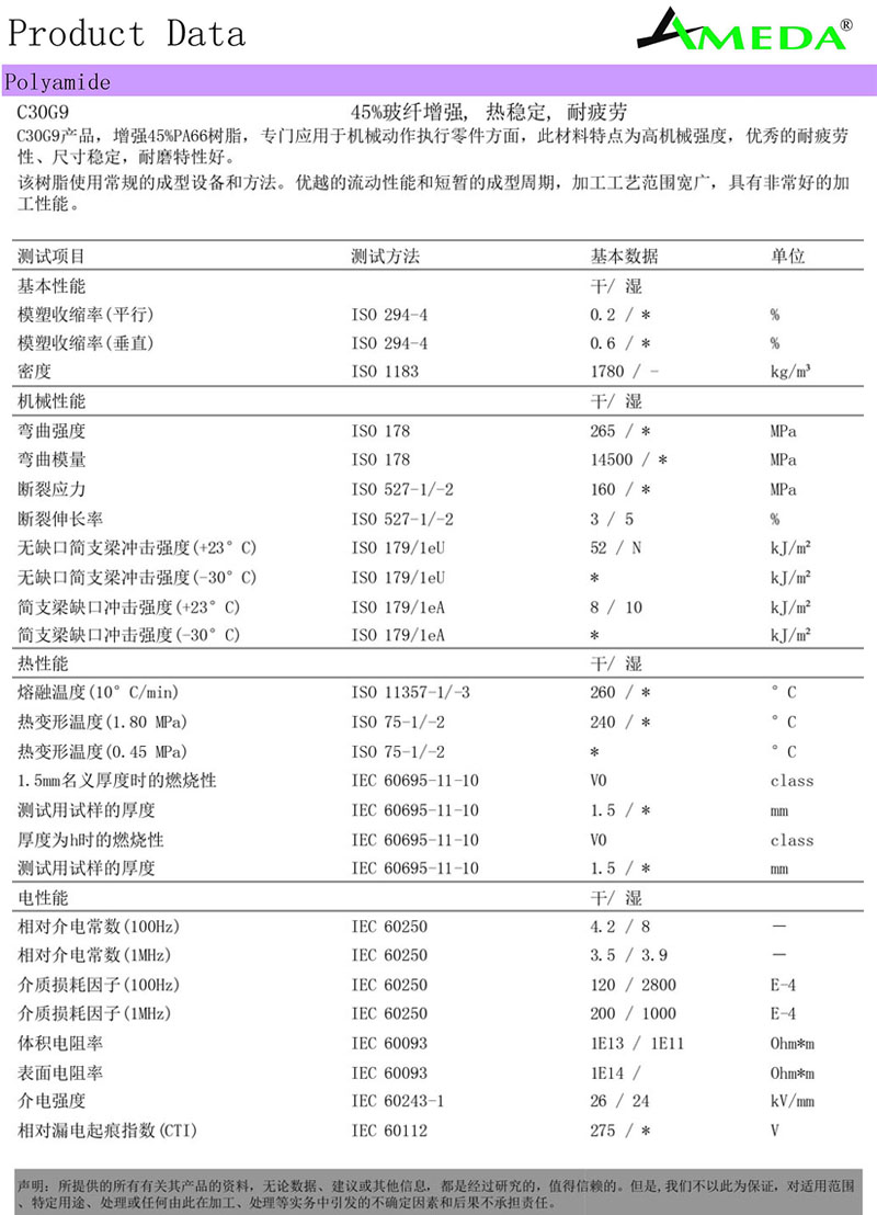 C30G9产品是玻纤增强45%PA66树脂,热稳定,耐疲劳,专门应用于机械动作执行零件方面,此材料特点为高机械强度,优秀的耐疲劳、尺寸稳定,耐磨特性好。