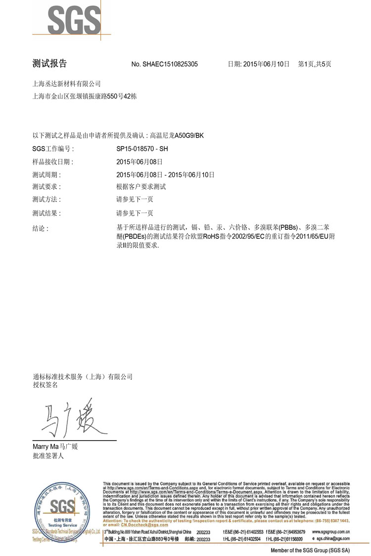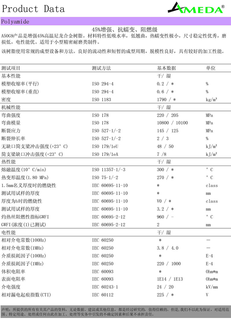 A50G9 产品是增强45%高温尼龙合金树脂,抗蠕变,阻燃级,材料特性低吸水率,低翘曲,热蠕变性极小,尺寸稳定优秀,磨损低,电性能优。使用于小型精密耐磨类制件。