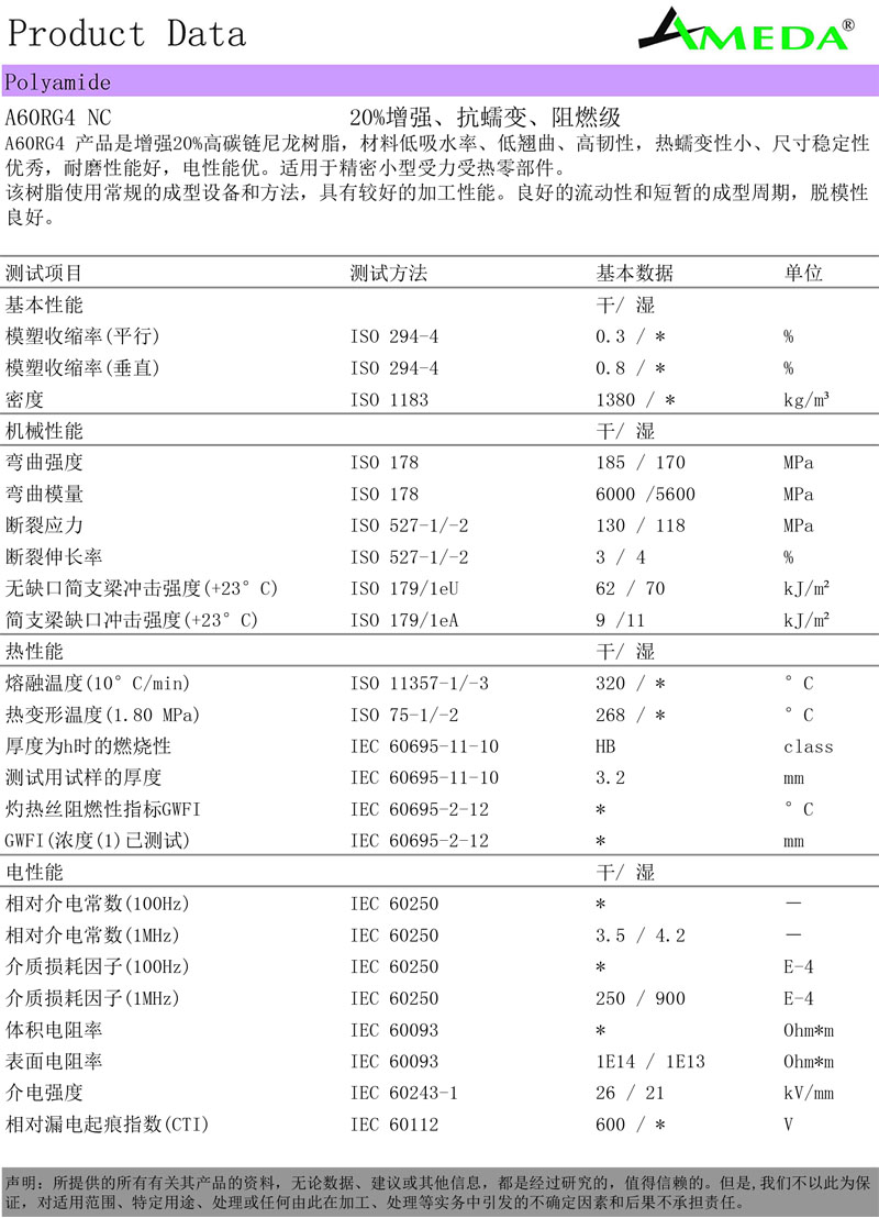 A60RG4 产品是增强20%高碳链尼龙合金树脂,抗蠕变,阻燃级,材料特性低吸水率,低翘曲、高韧性,热蠕变性极小,尺寸稳定优秀,耐磨性能好,电性能优。
